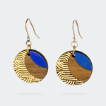Striking circular earrings featuring bold blue and gold geometric patterns with textured metallic details. Inspired by celestial movements with contemporary flair.