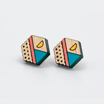 Bold geometric stud earrings with intricate pattern details and vibrant colour blocking. Contemporary design that makes a sophisticated statement.