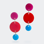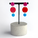Elegant layered earrings with graduated circular forms in vibrant pink, red and blue. Contemporary design with sophisticated colour progression and balanced proportions.