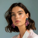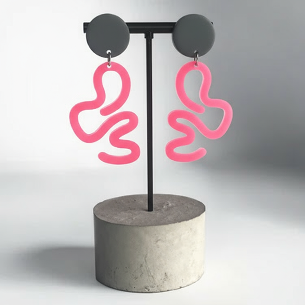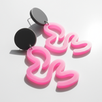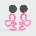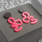 Playful curved earrings in vibrant pink with organic squiggle shapes and charcoal accents. Fun geometric design inspired by retro arcade aesthetics.