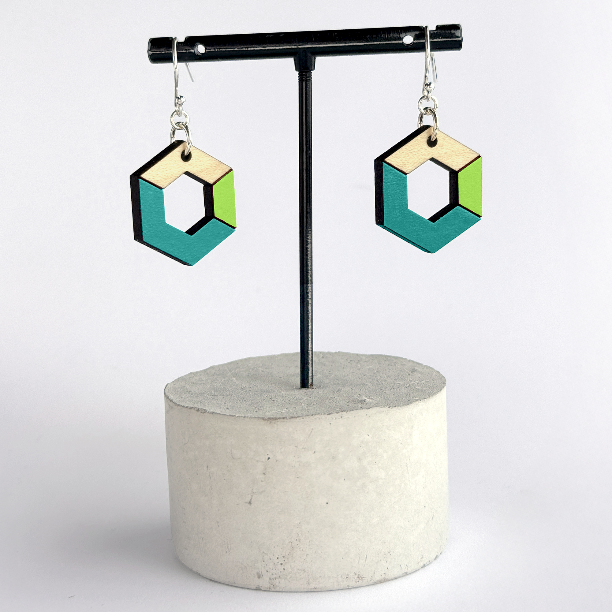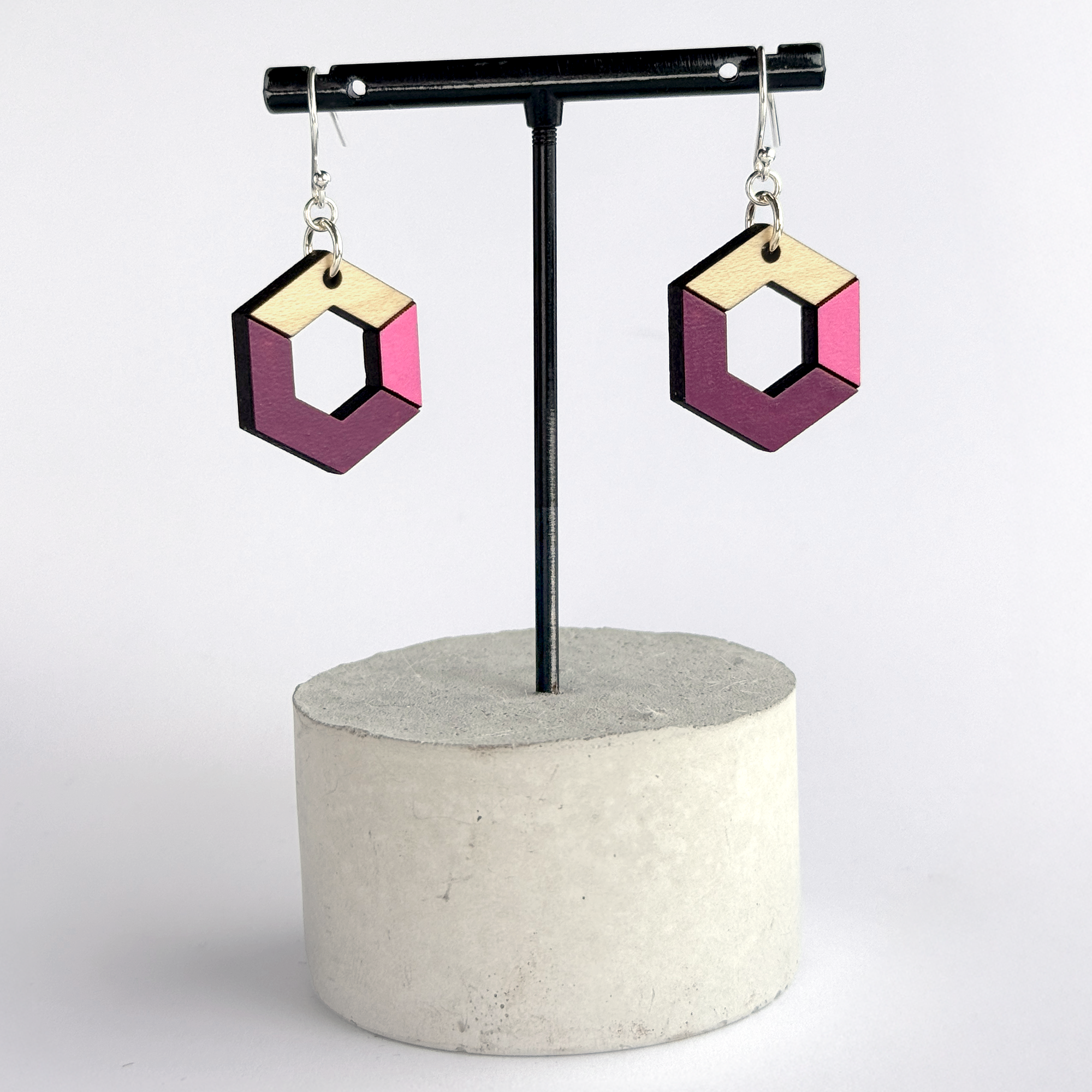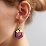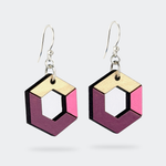 Bold hexagonal earrings in rich colourful tones with striking geometric cutouts and detail. Modern architectural design with vibrant colour impact.