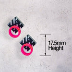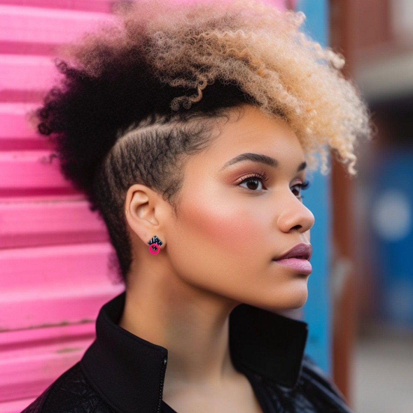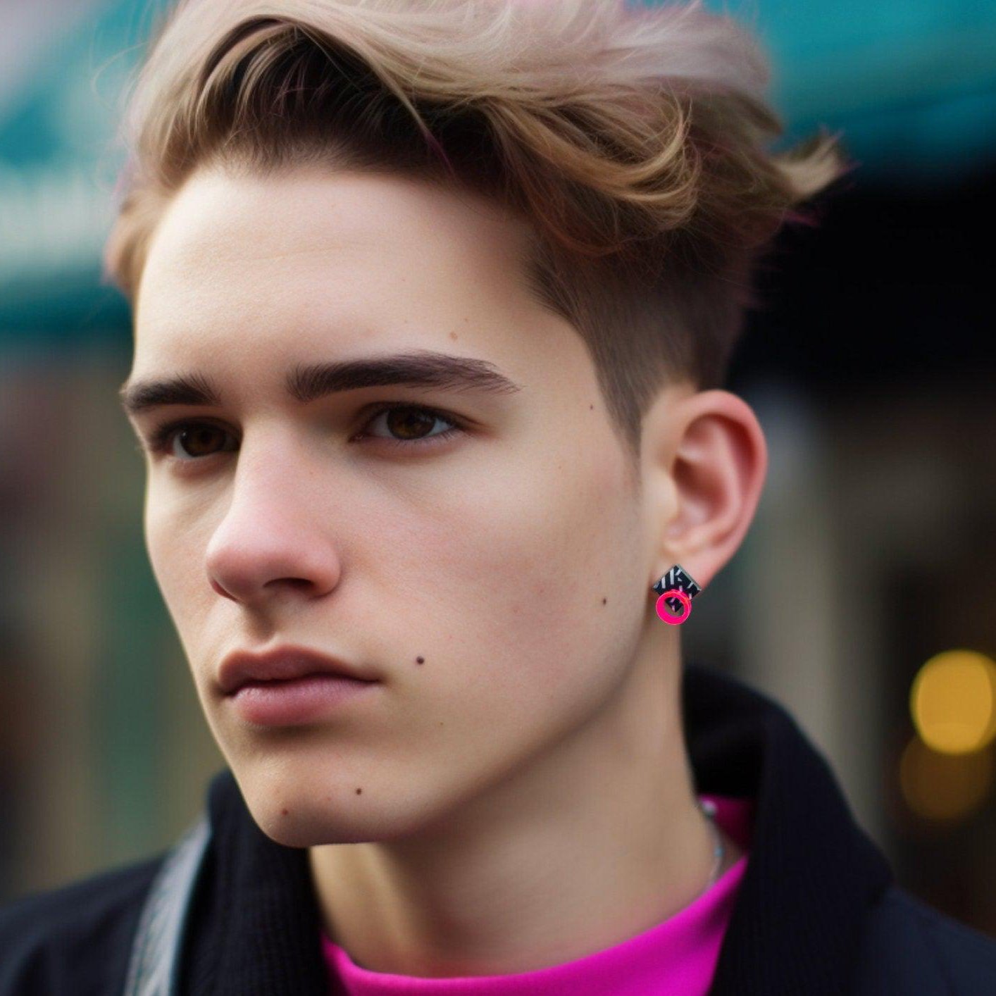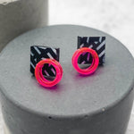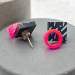 Pixel Perfect with the Arcade Pixel studs. Inspired by the 8-bit graphics of vintage arcade games, these bold, graphic studs combine neon pink with sharp black and white patterns for a modern, retro-inspired look. Perfect for those who love to add a playful twist to their everyday style, these studs are designed to turn heads.